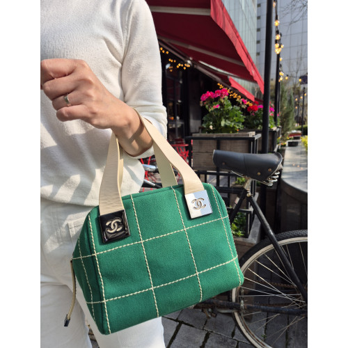 샤넬 그린 초코바 스티치 캔버스백